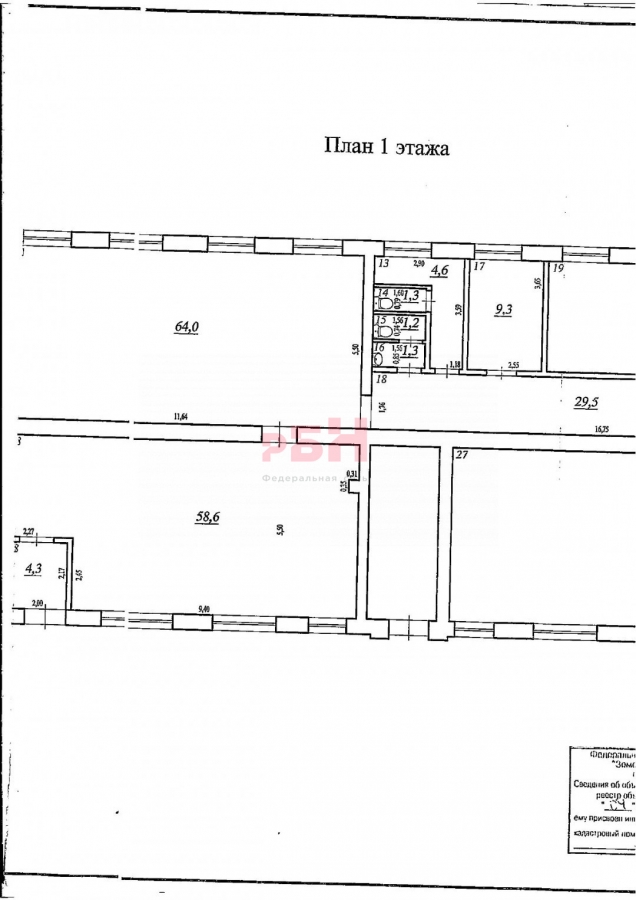 Общая площадь 817 м2: 1 этаж 580 м2, подвальные помещения 237 м2.
